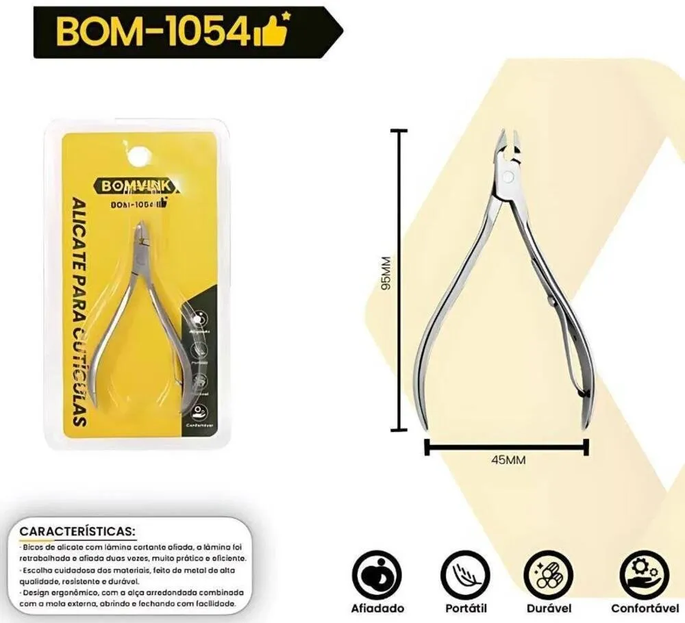 O Alicate para Cutículas Bomvink BOM-1054 foi desenvolvido para proporcionar precisão e segurança na remoção de cutículas. Com lâminas afiadas e acabamento resistente, oferece corte eficiente e controle durante o uso.
